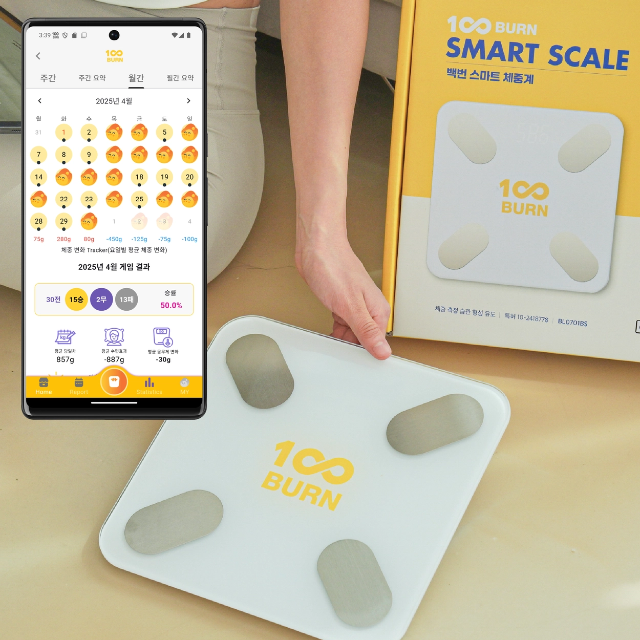 100BURN Smart Scale that reports the results of daily weight management games by 100Burny